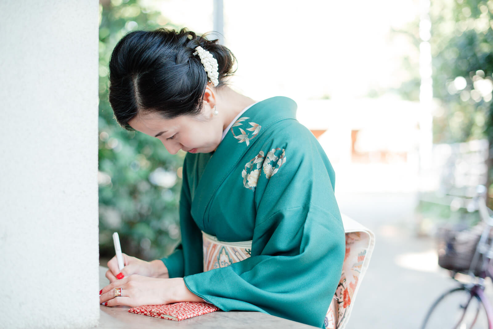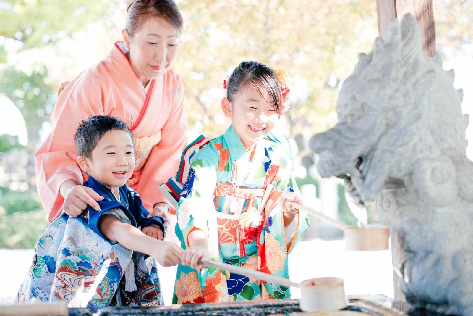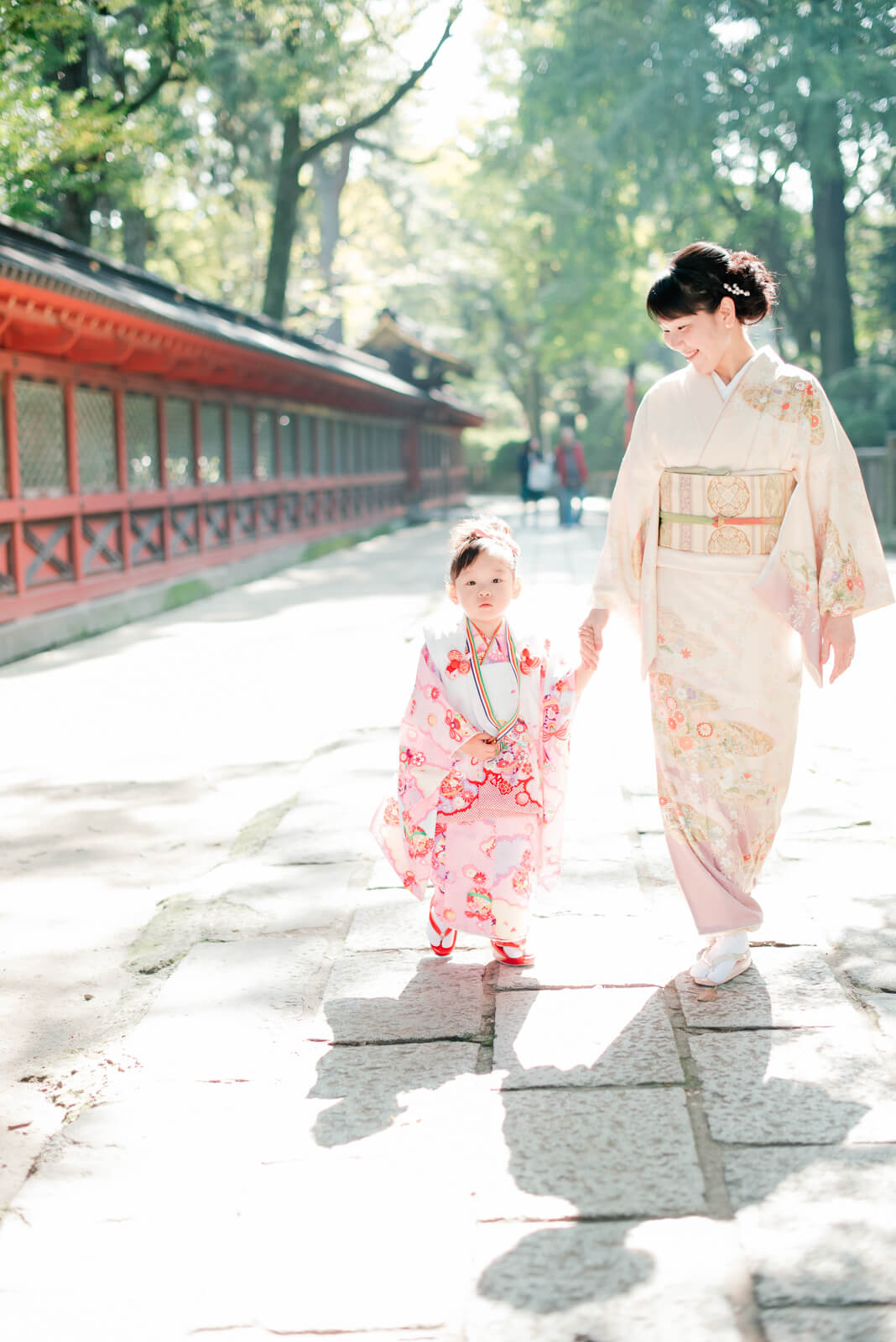 お父様とお母様の後ろ姿を見て「なんだか結婚式みたいだね」と言いながら嬉しそうな顔をみせてくれたお子様。手水舎でお着物や袴が濡れないように手を添える姿も、普段のご家族の姿なのだと感じました。七五三という節目の一日。お母様もとても嬉しそうで和やかな表情です。