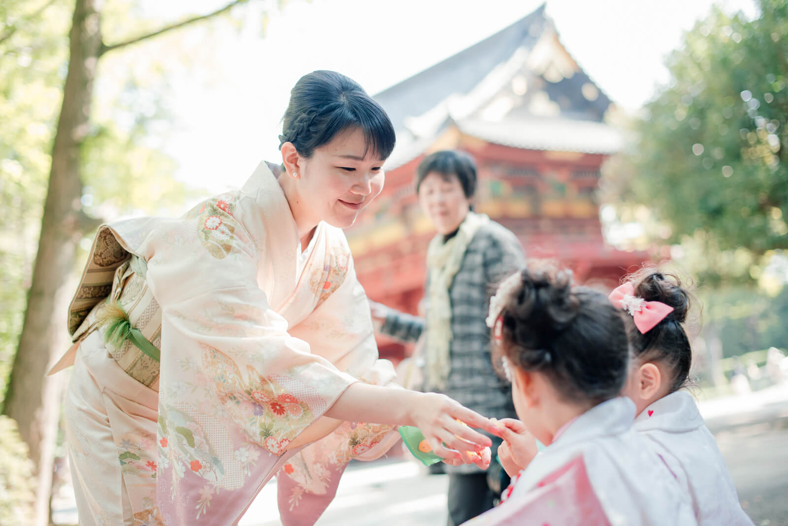 双子のお子様と一緒にお祝いを楽しむお母様です。優しいお色のお着物がとてもお似合いです。元気ざかりのお子様で、お着物をきているにもかかわらず、かけっこをしてしまいますがそれもいつもの可愛らしい姿。お母様も一緒になって走っている様子がとても素敵ですね。