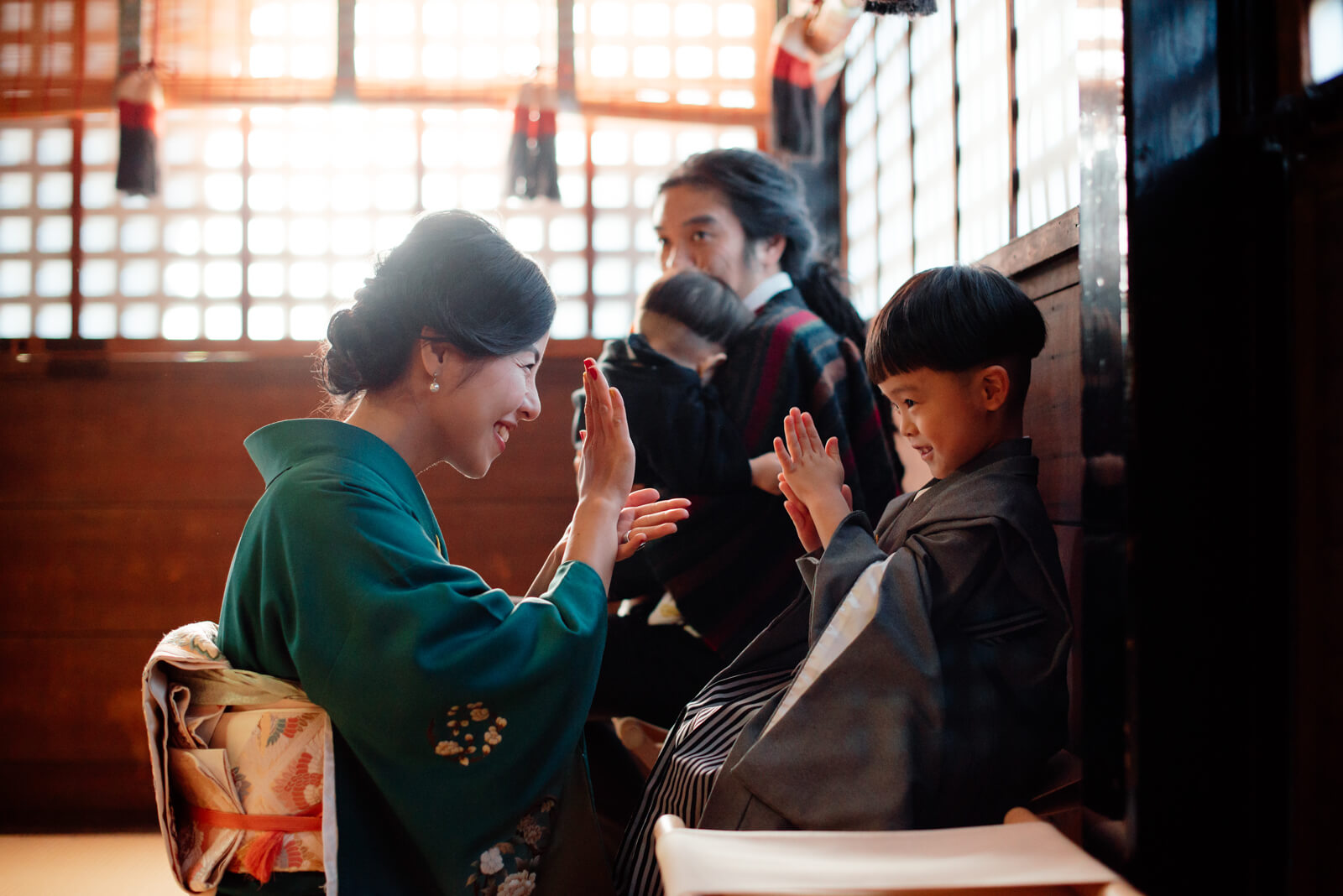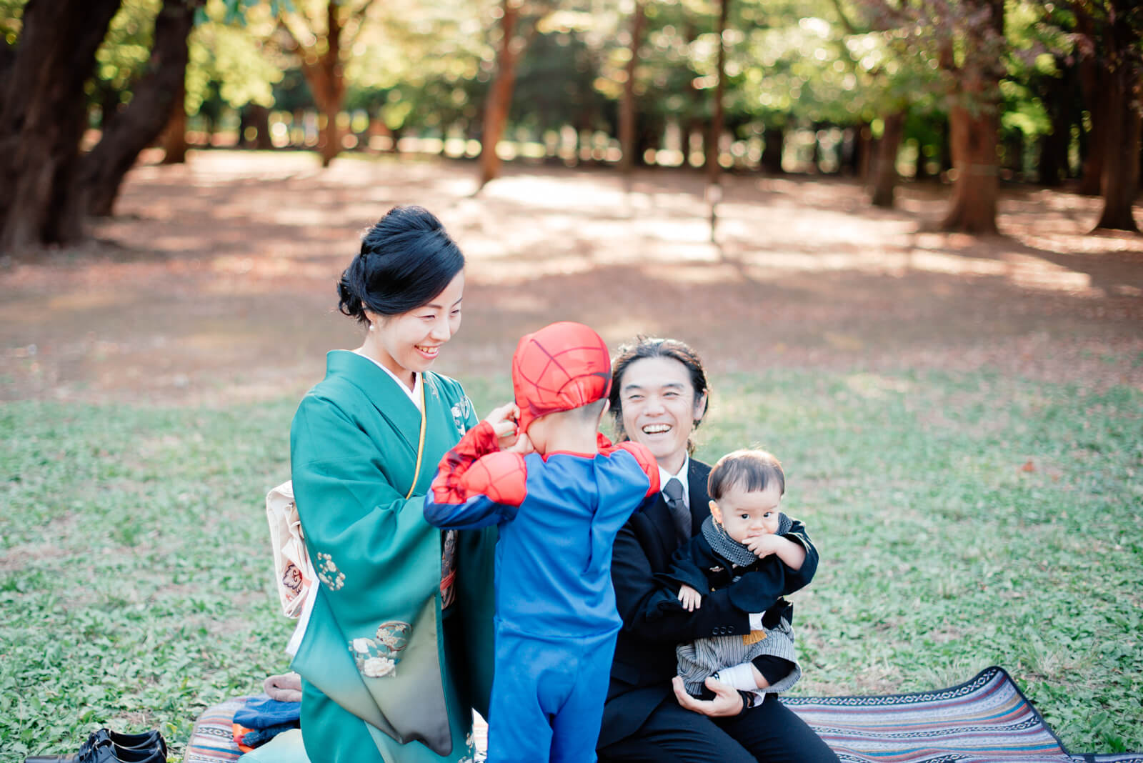 グリーンのお着物がとても素敵です。少しレトロな雰囲気で揃えたご家族らしさが溢れるような姿ですね。お子様の健やかな成長を神様にお伝えする前、こっそりと手遊びをするお母様の笑顔はとてもきらきらしています。お家でもいつもこうして遊んでいることが想像できました。ご祈祷のあとは大好きな公園に移動してお子様はスーパーヒーローに変身!お着替えを着替えるお母様の優しい表情が良いですね。