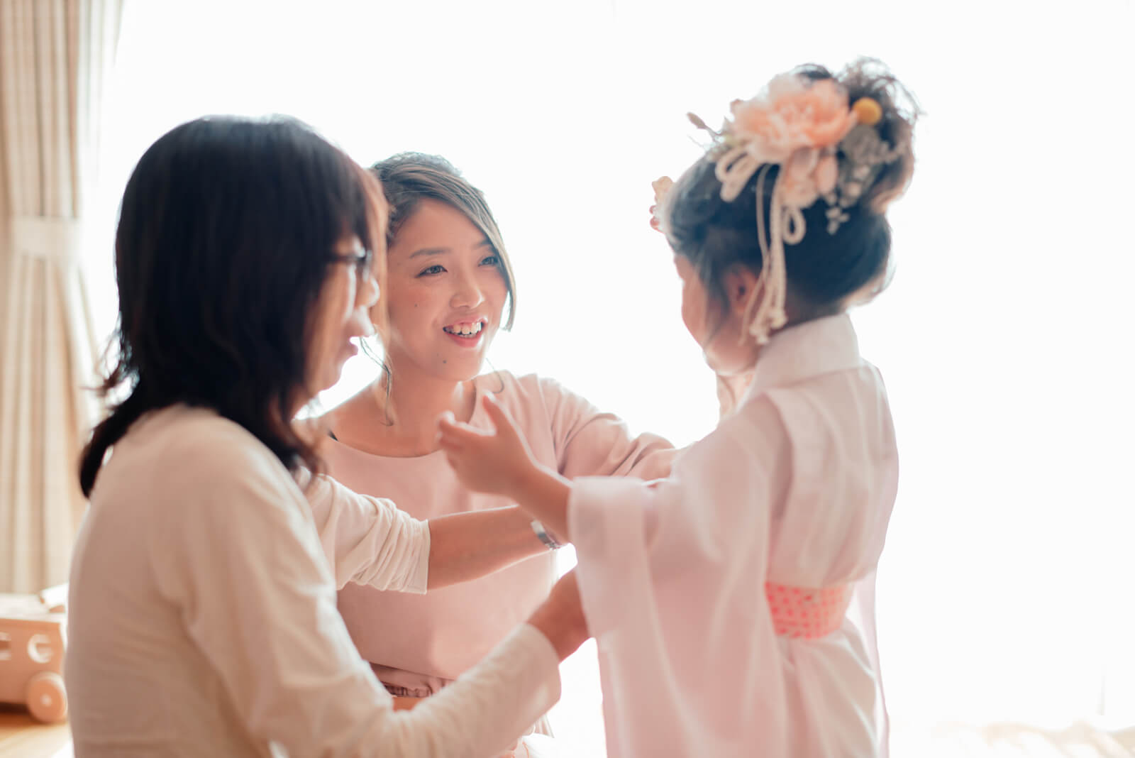 出発まえにお子様の着付けとメイクをされているお母様です。お子様の可愛らしい姿に自然と笑みが溢れています。ご自宅での着付けだったので、お母様もお子様もとっても自然な表情です。普段通り、自然に気を張ることなく過ごす時間がなによりも暖かくお母様にとってかけがえのない一日になっていることを感じるお姿です。