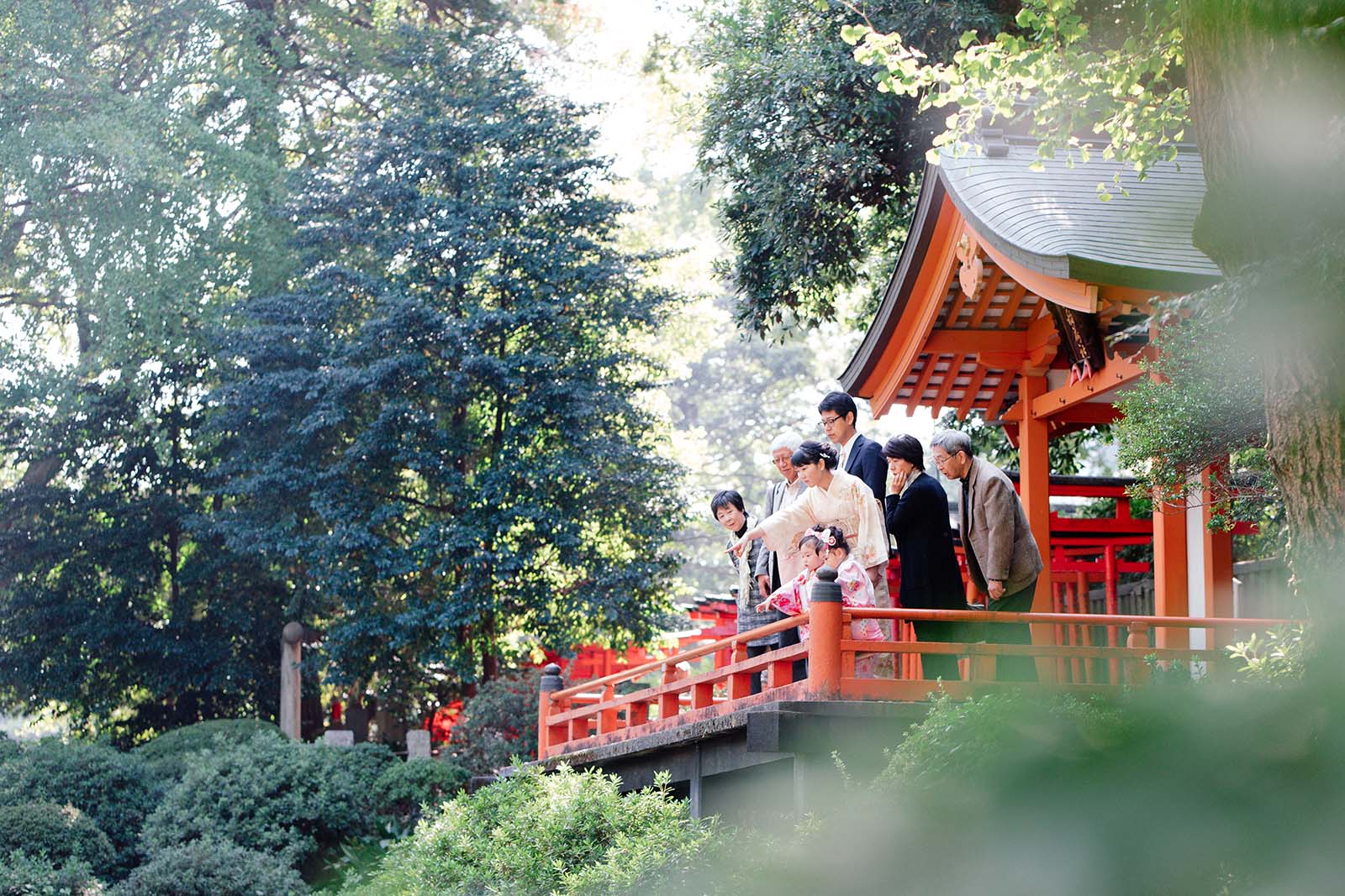 全員で真剣な眼差しで境内の池を覗いています。実この時この場所で、集合写真を撮影しました。その直後の自然なお時間です。少し離れたところから和やかなお時間を見守らせていただきました。