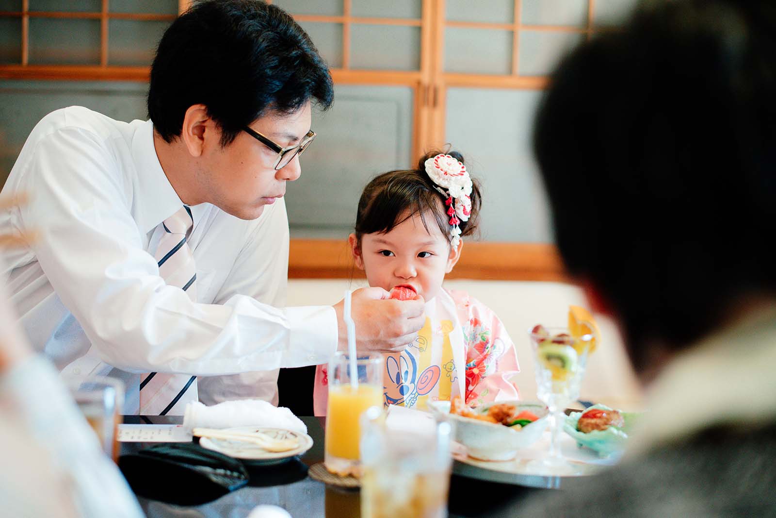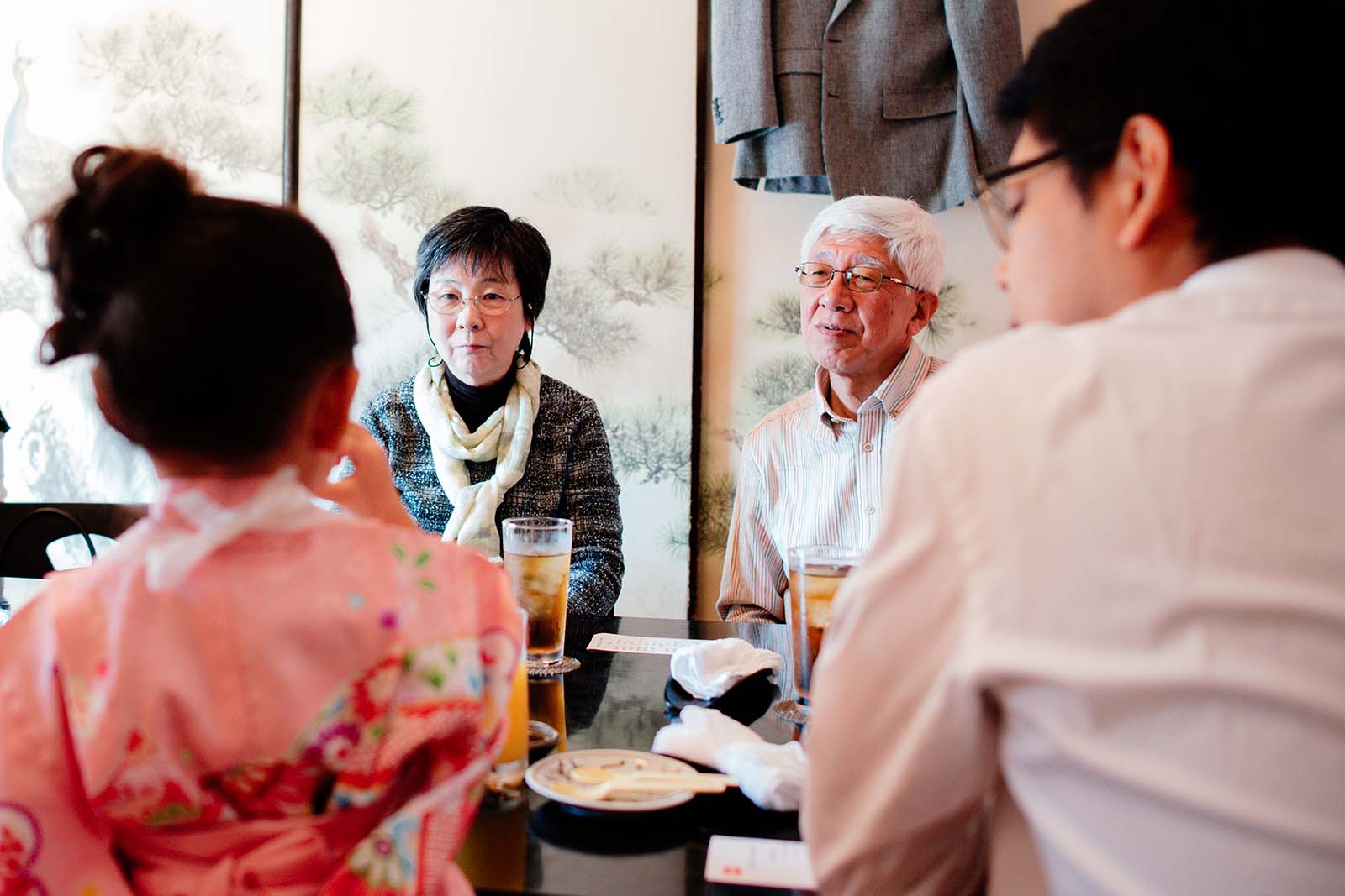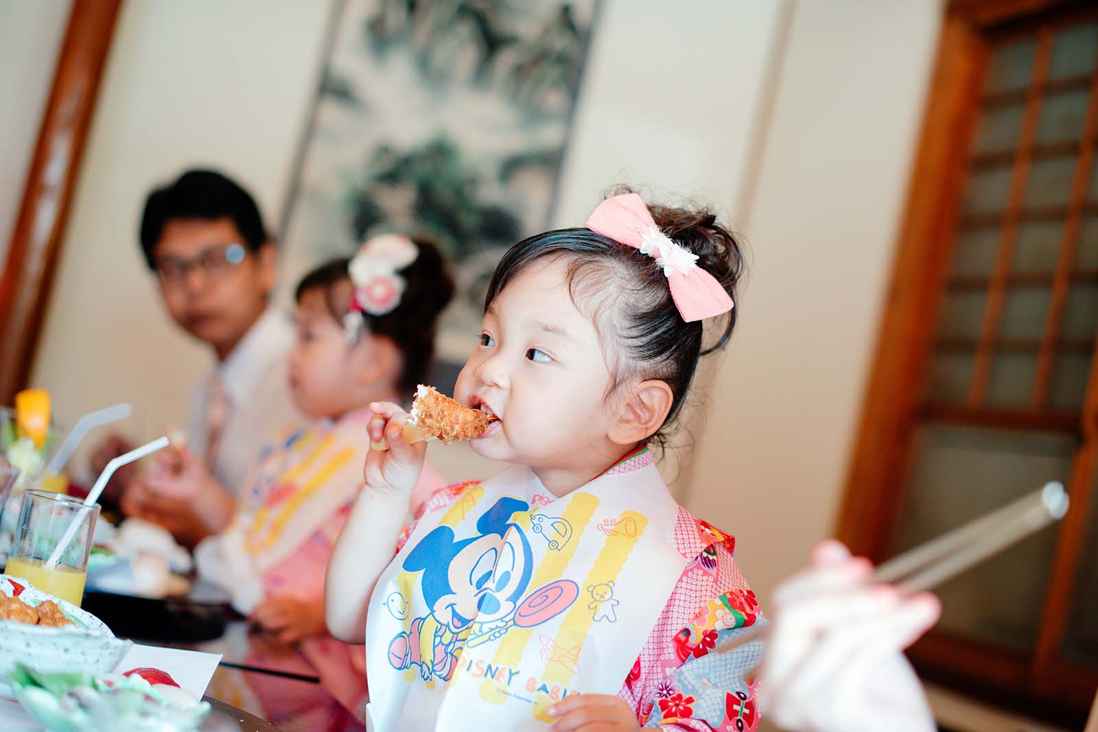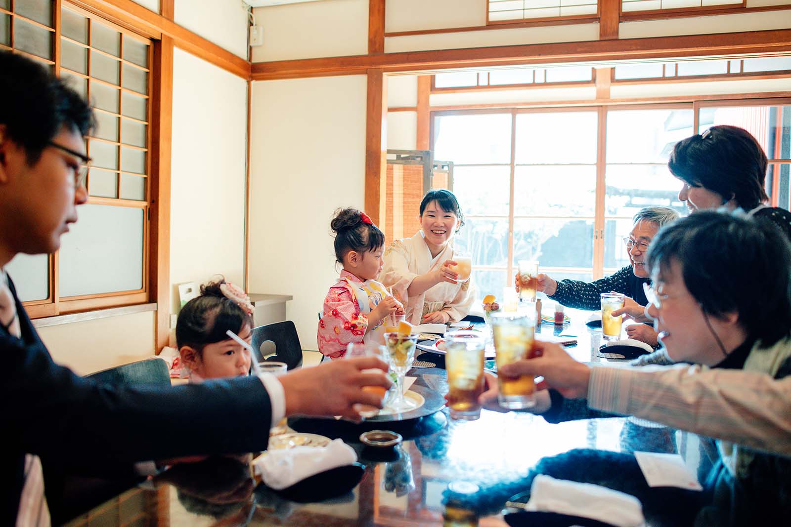 大切な節目をお祝いして、みんなで食事です。お座敷ではお着物で正座をしてみたり、足を伸ばす事もできてお子様たちもリラックスしているご様子でした。