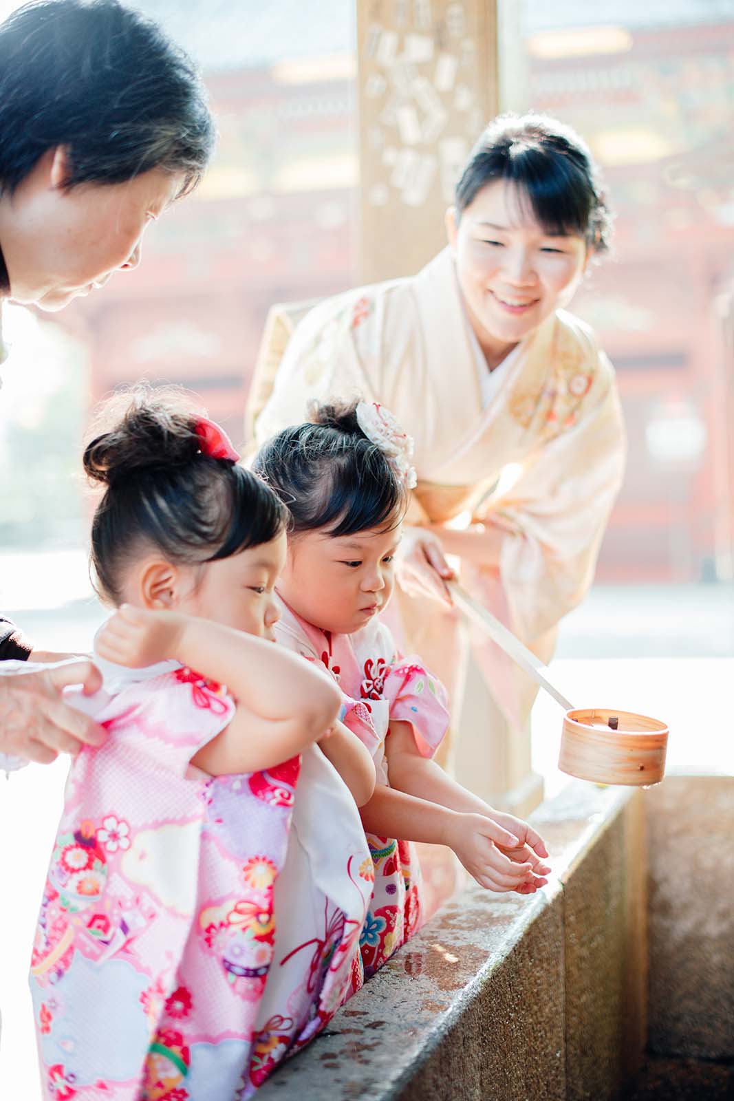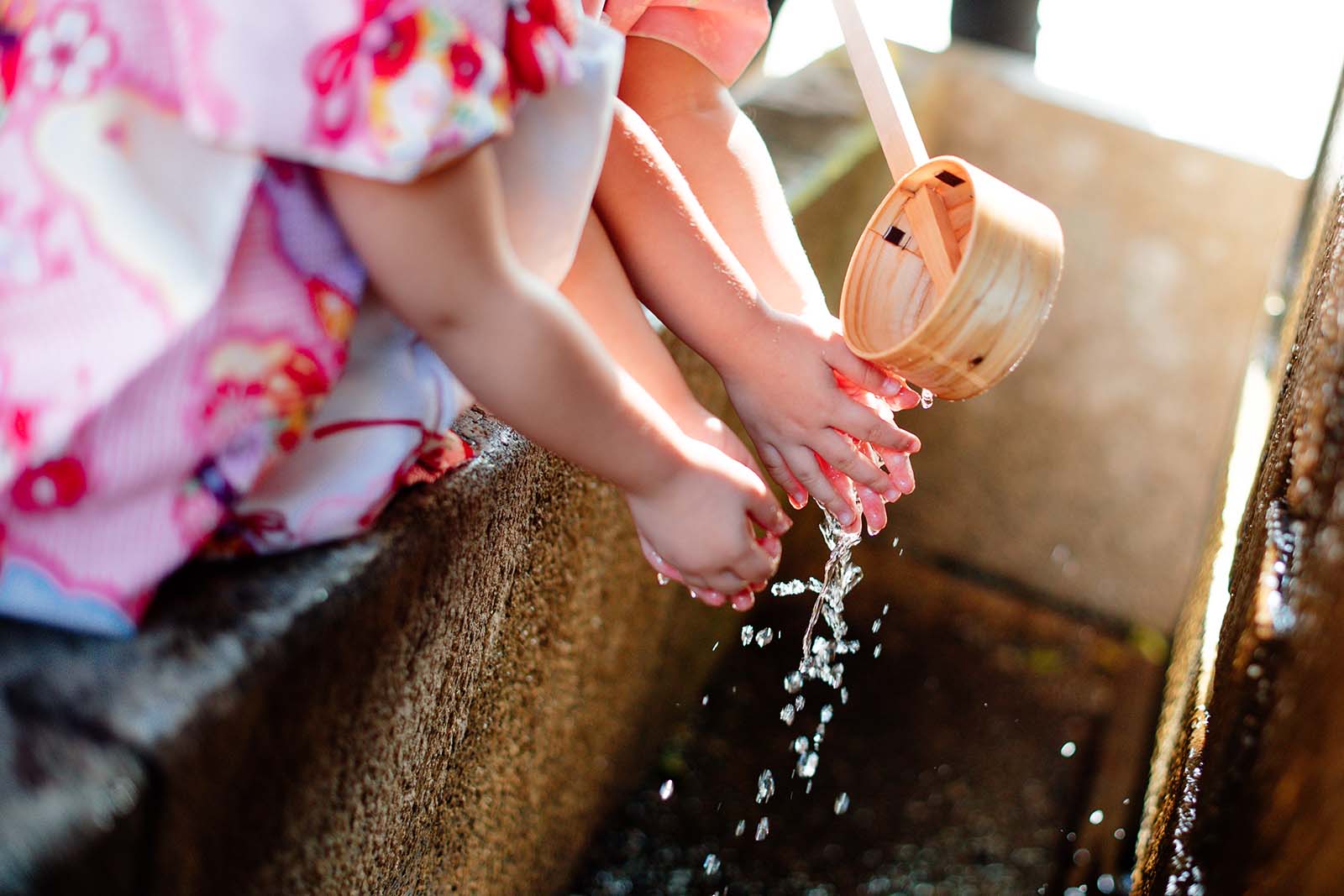 慣れないお着物をきていても、お父様とお母様に助けてもらいながらしっかり手水を行います。