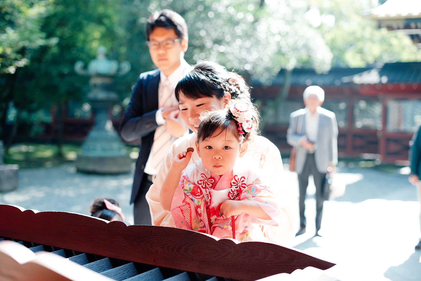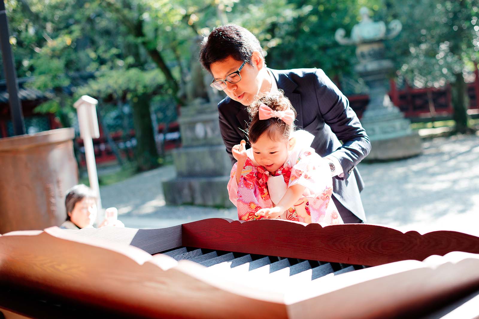上手に参拝ができました!一人ずつ、順番に抱っこしてもらいながらお賽銭をしてお願いごとを神様に伝えます。