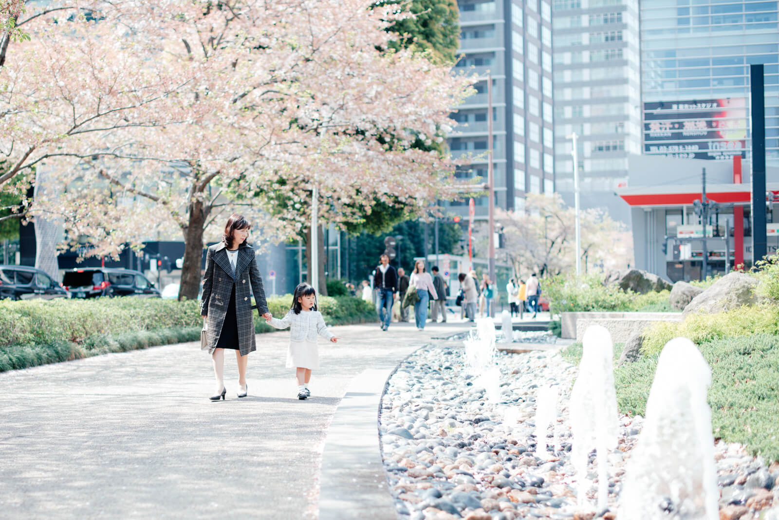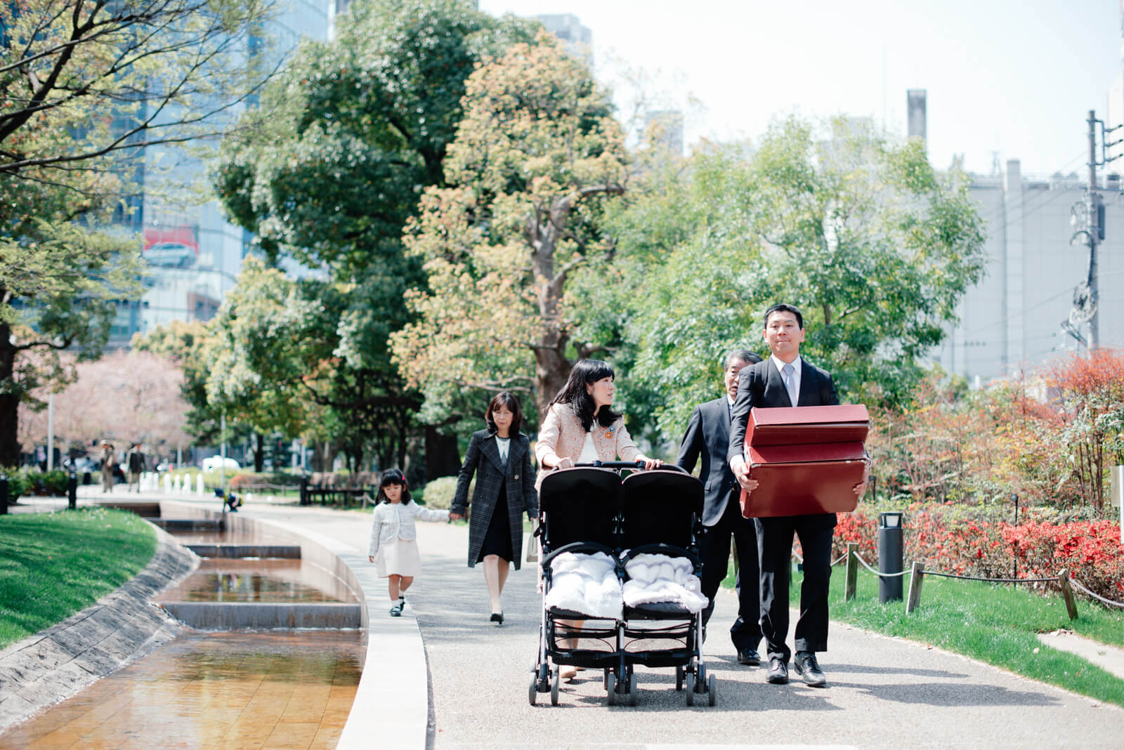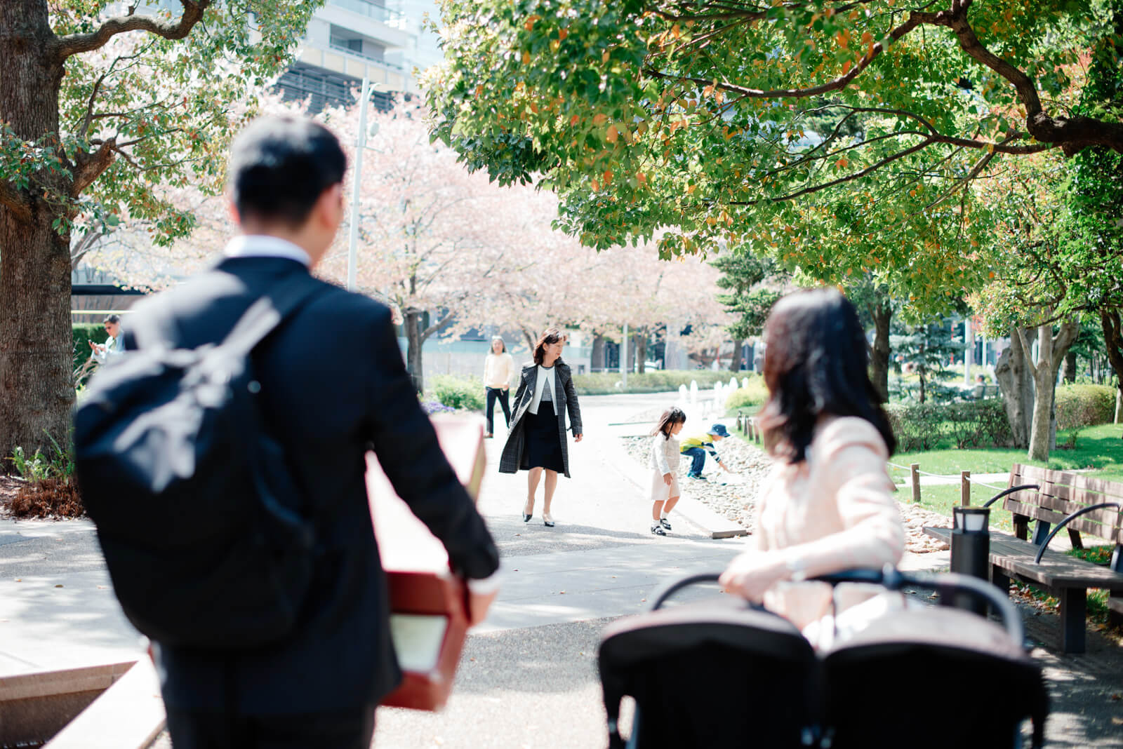 ついつい春の陽気に寄り道をしたくなってしまうお姉さんを、あたたく見守るお父様とお母様。家族がみんなで大切に過ごしている時間が流れていました。両手いっぱいに荷物を抱えているお父様らしい姿がなんだかとても素敵です!
