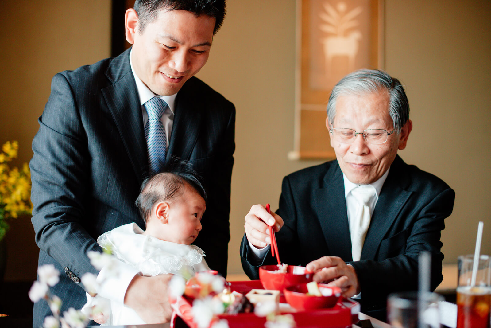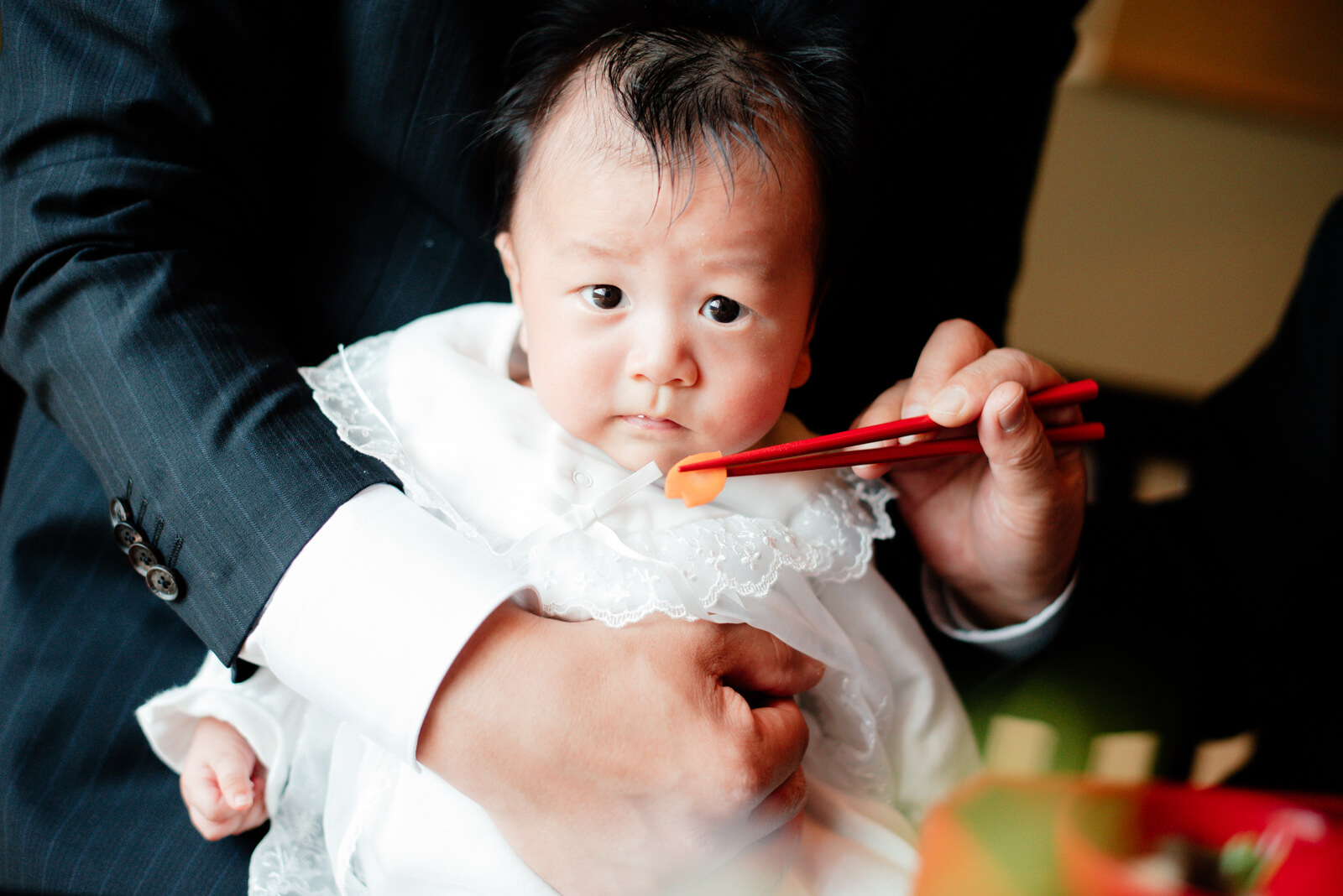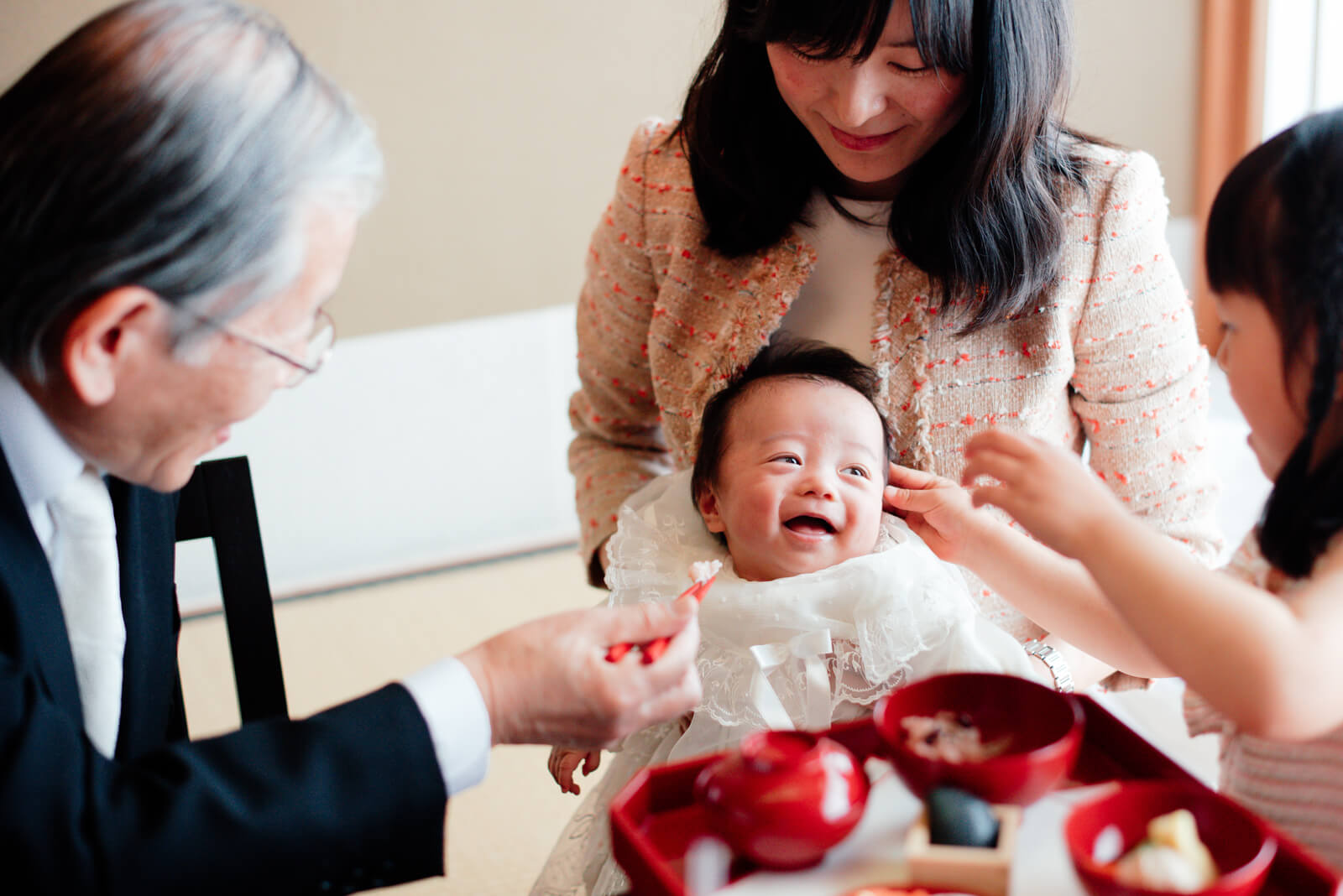 おじいさま、おばあさまが順番にお食い初めをしました。不思議そうな表情で見つめていますね。
