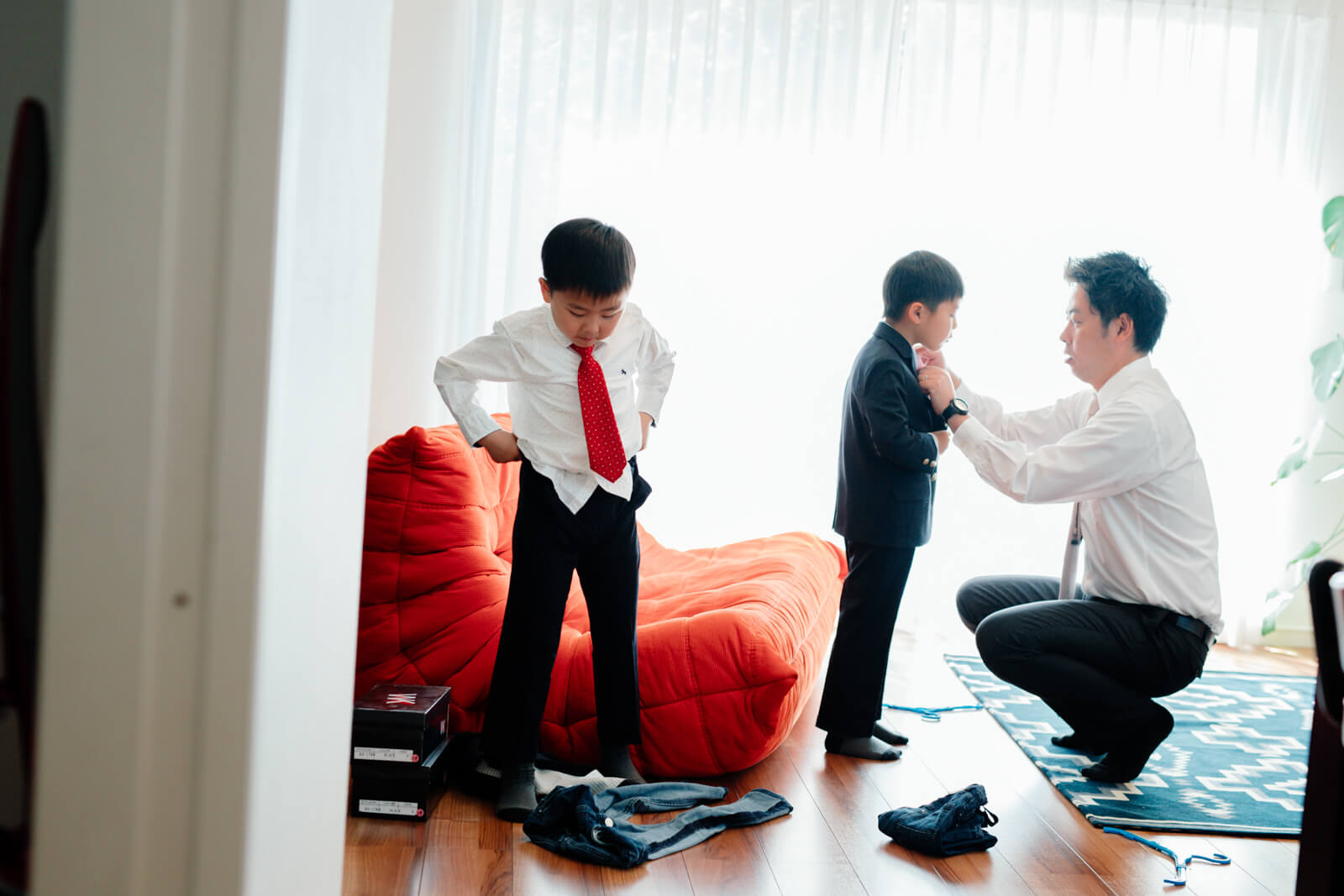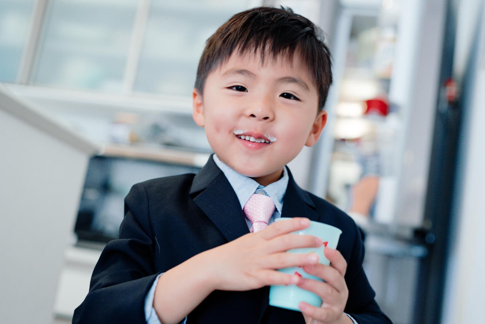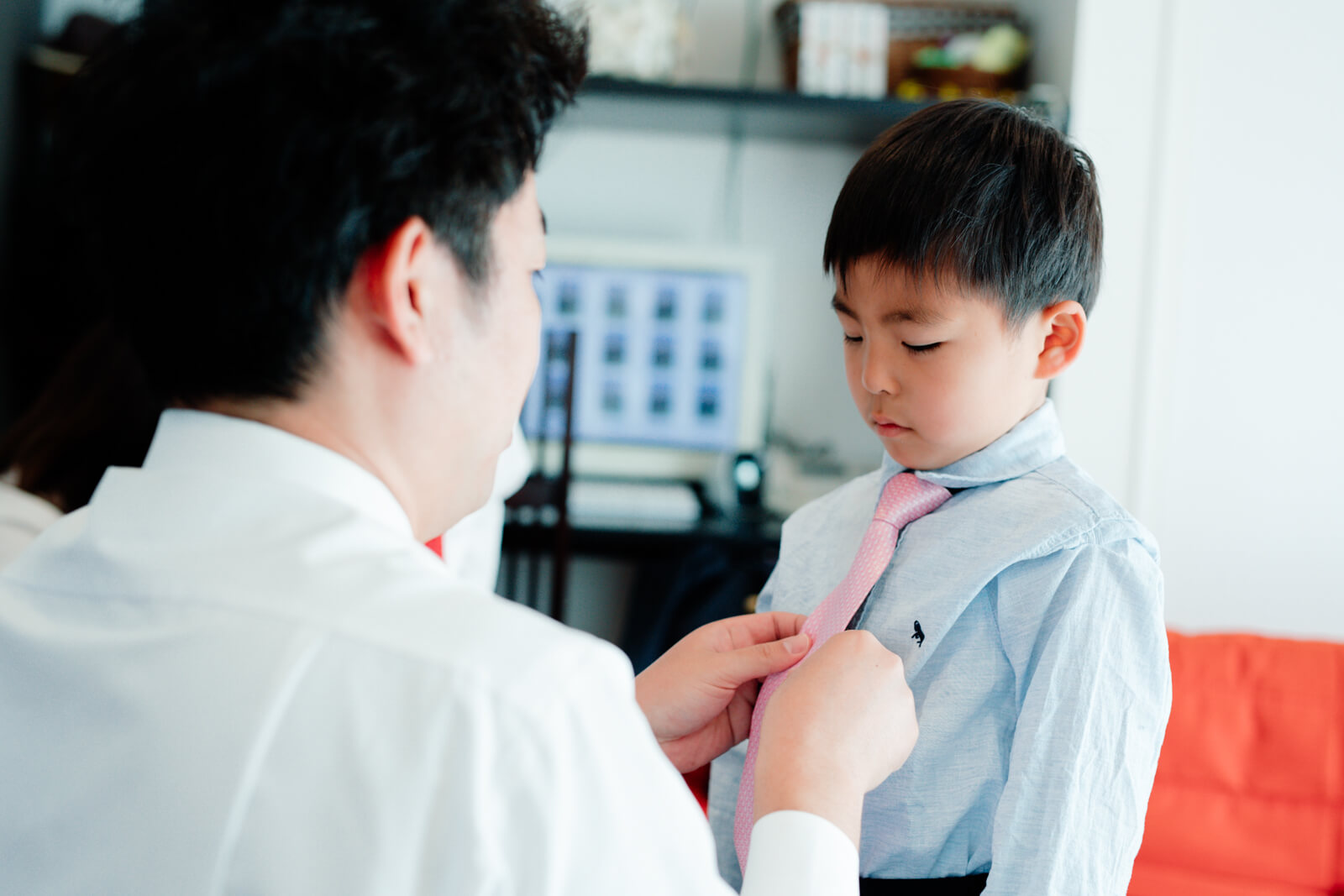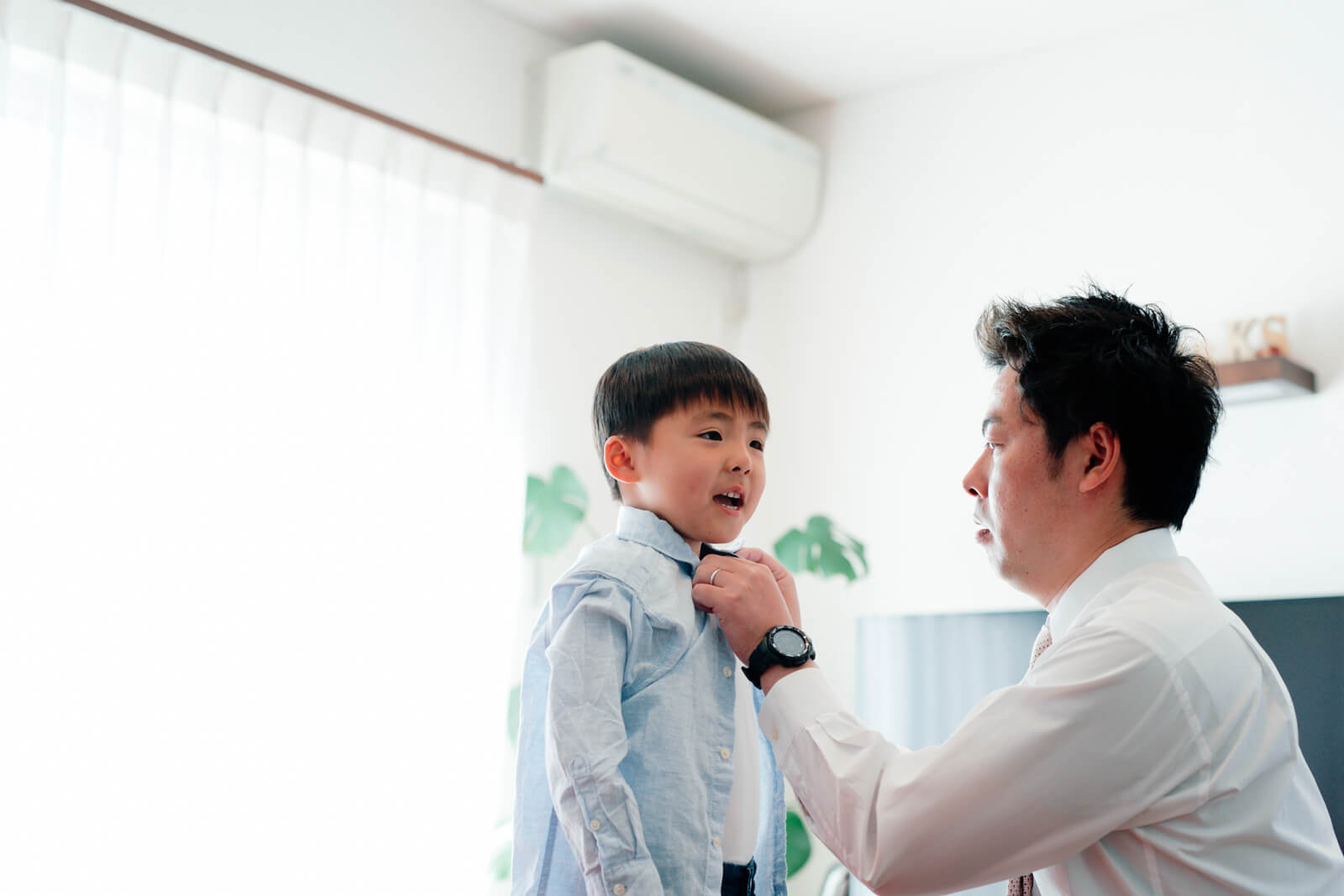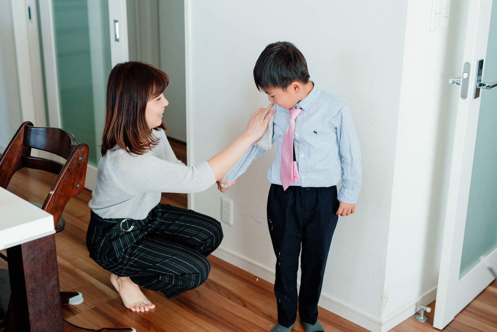 お父様やお母様は毎日お子様と一緒にいるので、お子様が朝起きた時や朝食をとる様子、着替えをする姿など見慣れている光景かもしれません。ですが、入園・入学式の朝はその日だけです。お子様がわくわくしていたりちょっと緊張している表情や、上手に正装に着替えられないぎこちない様子などもその日だけのかけがえのない瞬間ではないでしょうか。そういった日常的な中でもなんだかちょっといつもと違う写真が将来かけがえのない宝物になるのです。