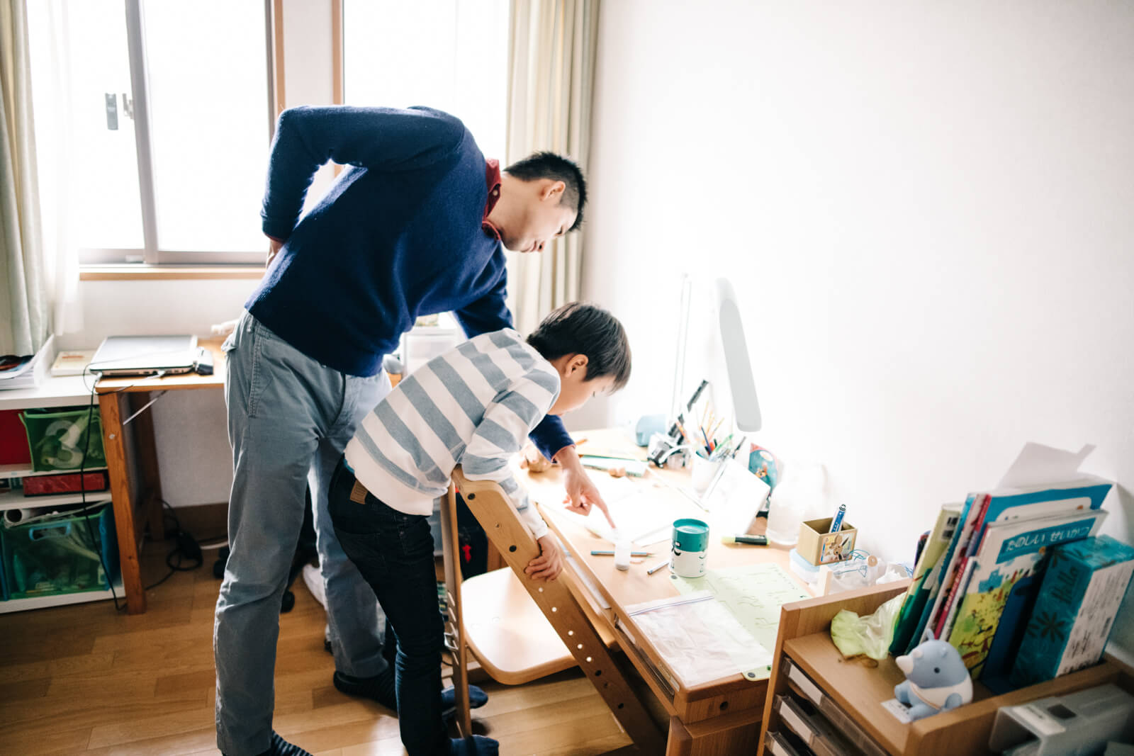 2階にある勉強机での1コマです。お小遣い帳を記載するところです。何度計算しても収支が合わない!お父さんのヘルプをもらいながらなんとか締め作業終了です。
