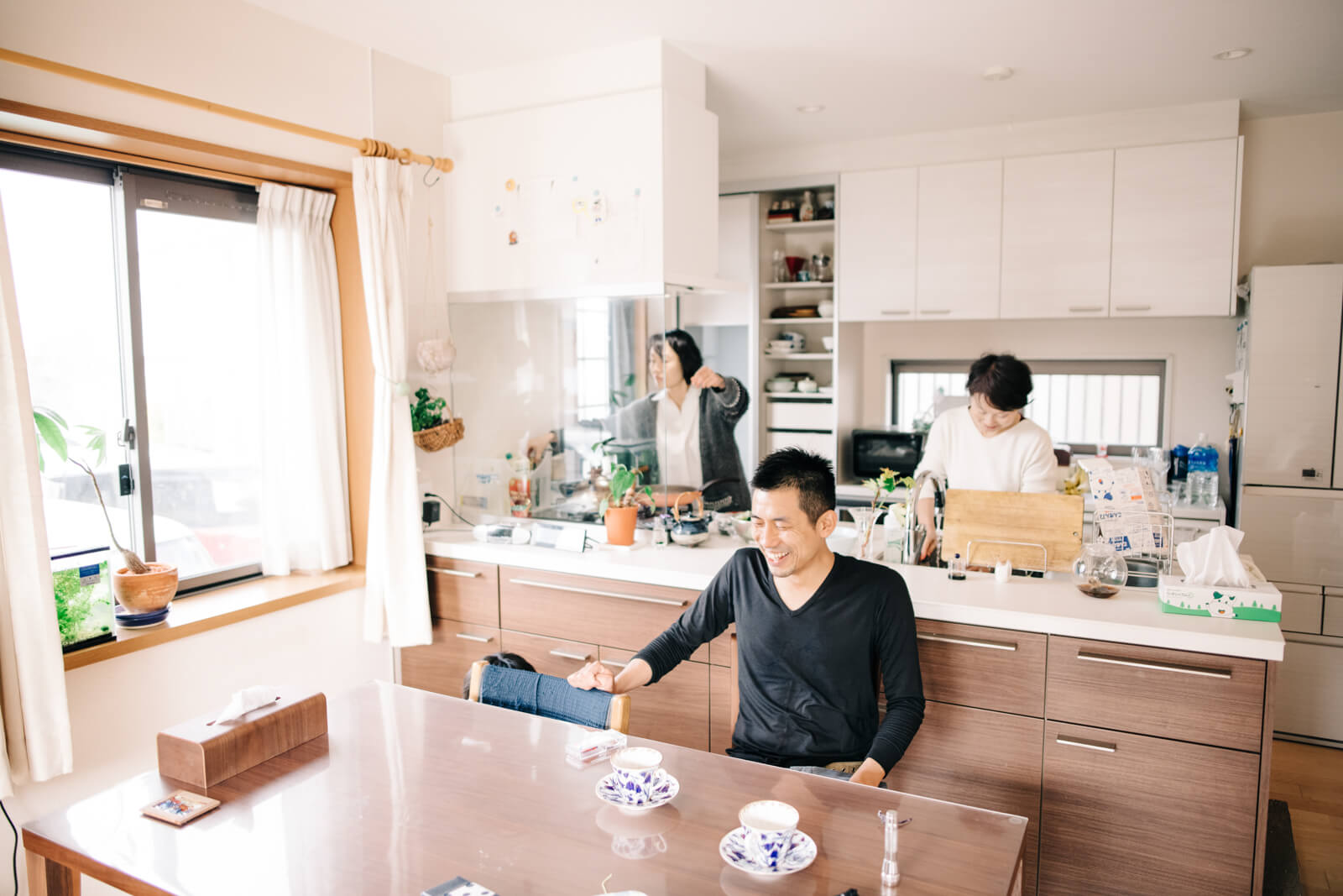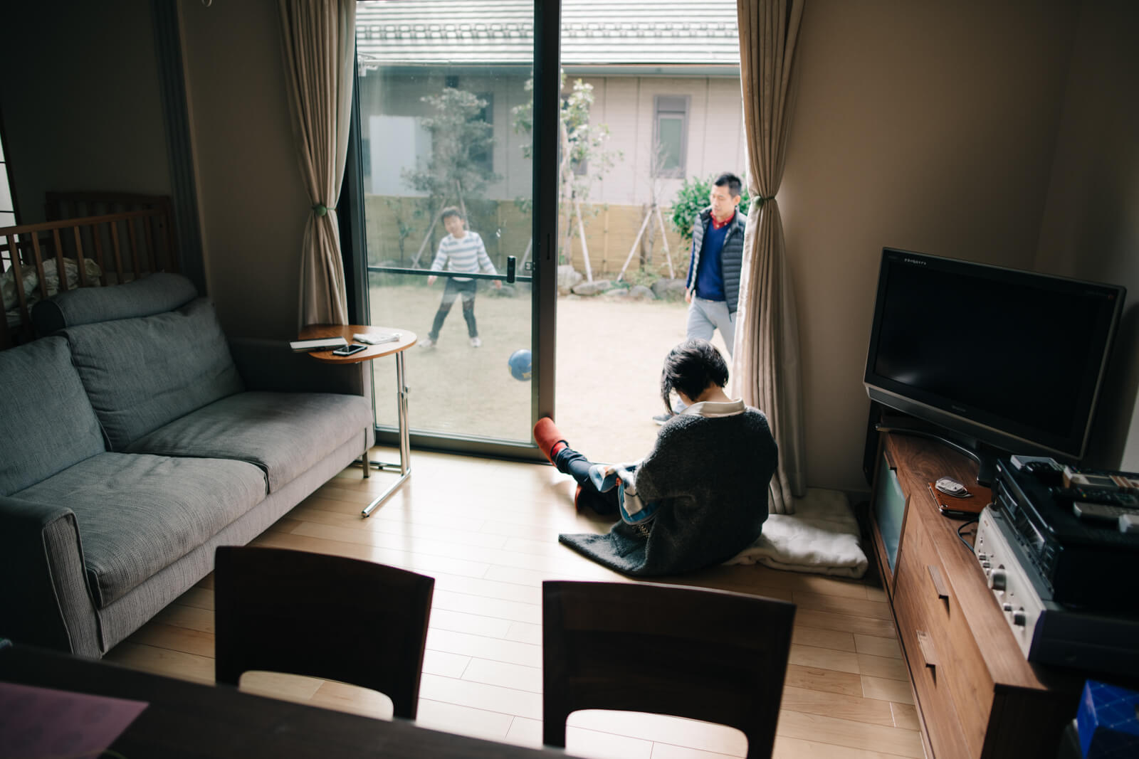 お子様をだっこしたお母様がお庭で遊ぶ親子を微笑みながら見る。ご家族らしく、また、いつもの暮らしぶりが垣間見れる私の好きな1シーンです。室内とお庭のテンションはかなり違いました。