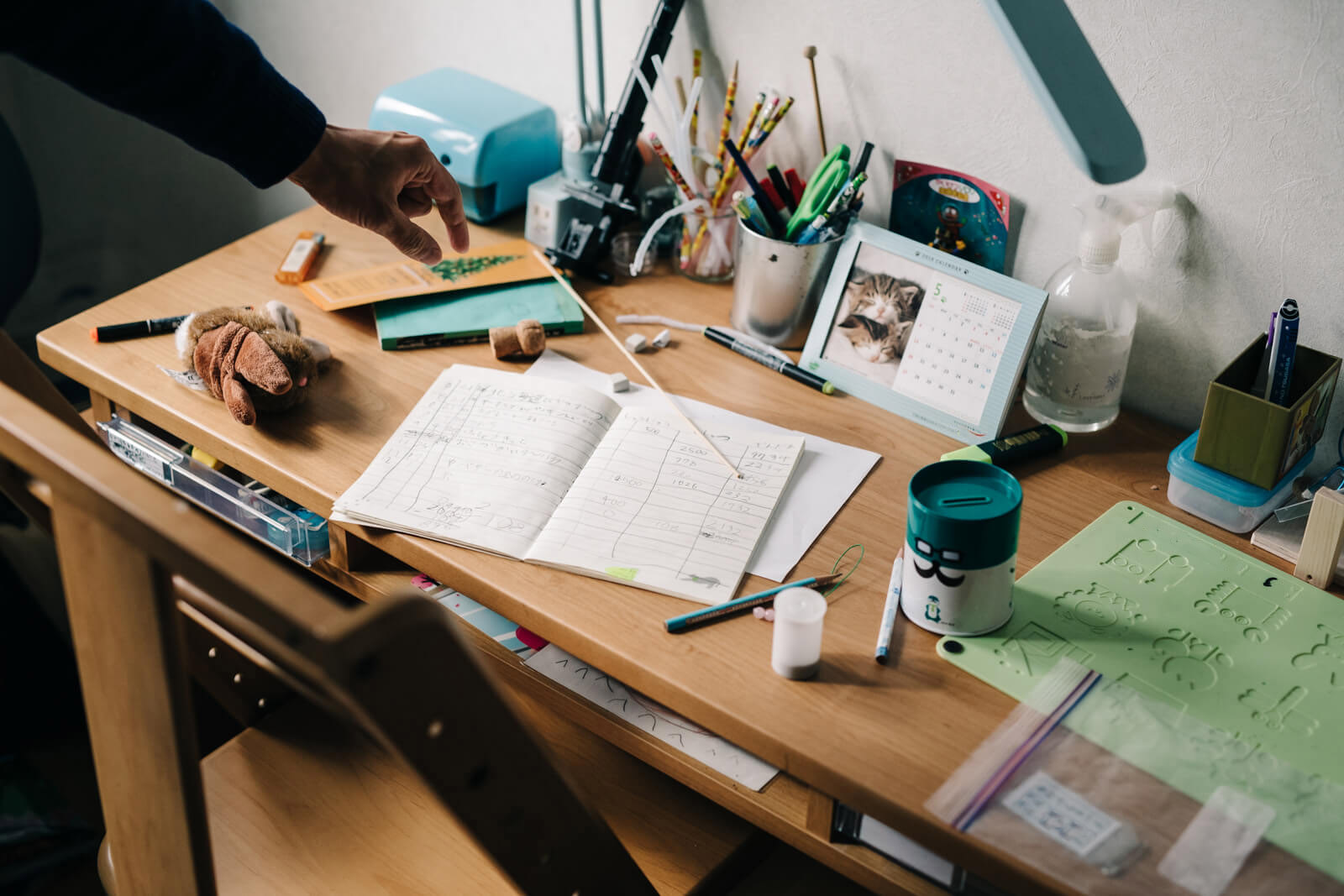 2階にある勉強机での1コマです。お小遣い帳を記載するところです。何度計算しても収支が合わない!お父さんのヘルプをもらいながらなんとか締め作業終了です。