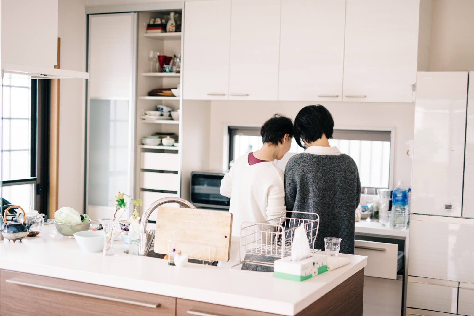 お庭ではサッカー後半戦に突入したタイミングで、キッチンで昼食づくりがはじまりました。肩を寄せ合うとはまさにこのことなんだなぁと。