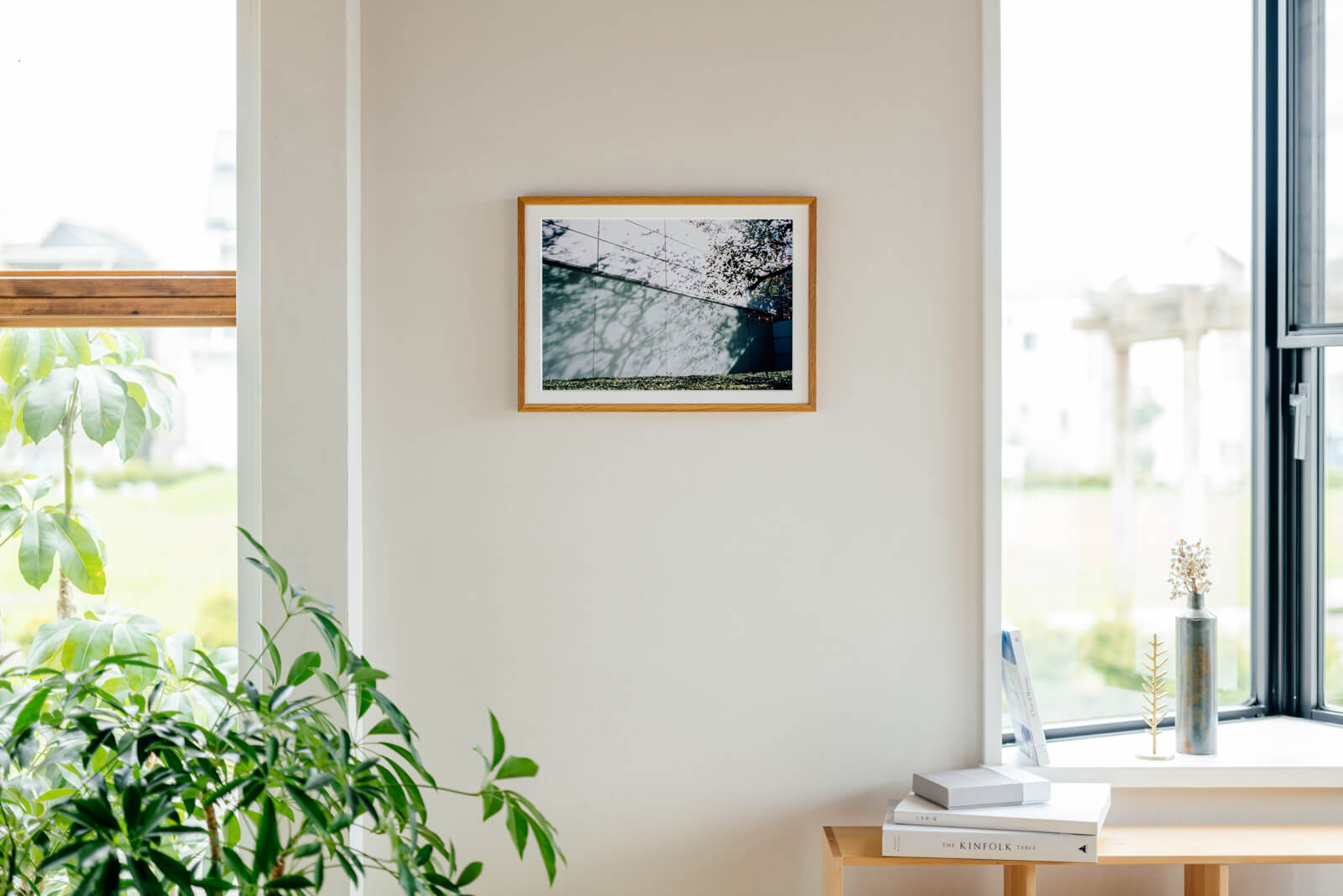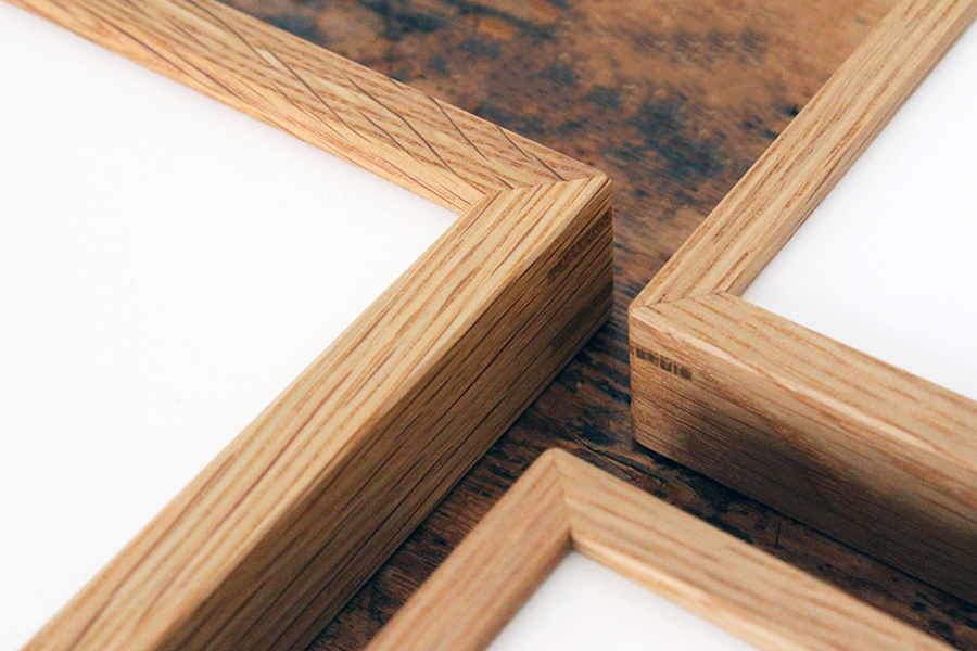 フレームは、細身(1.2cm幅)で凛としたシャープな雰囲気を持ちつつ、無着色でオイル仕上げのオーク材を使用しているため、ナチュラルな素材のあたたかみが感じられます。使用していくうちにオイルが馴染み、少しずつ艶を増し、色が濃くなっていく経年変化もお楽しみいただけます。