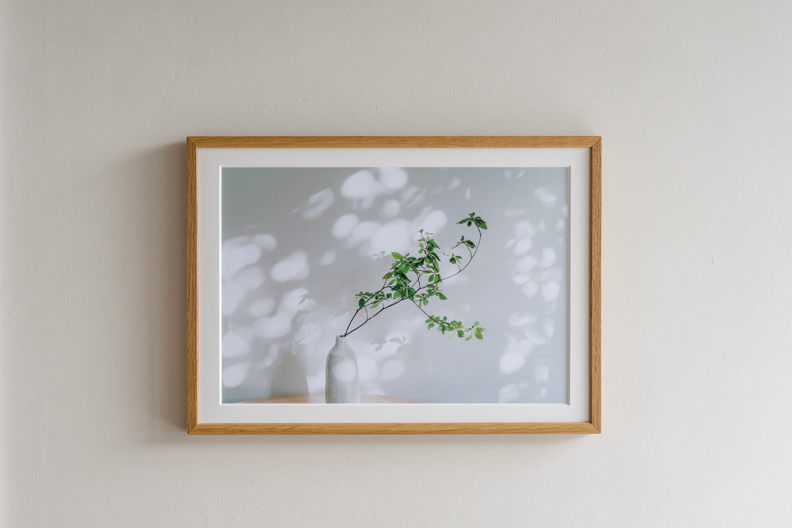 フレームは、細身(1.2cm幅)で凛としたシャープな雰囲気を持ちつつ、無着色でオイル仕上げのオーク材を使用しているため、ナチュラルな素材のあたたかみが感じられます。使用していくうちにオイルが馴染み、少しずつ艶を増し、色が濃くなっていく経年変化もお楽しみいただけます。