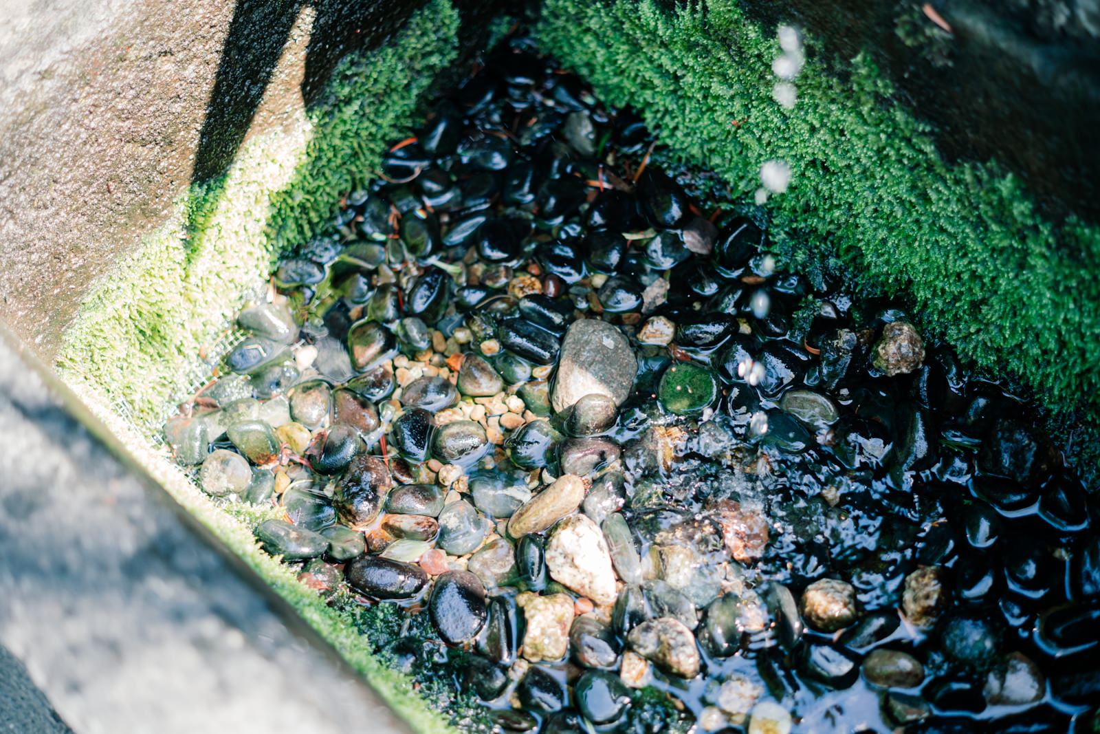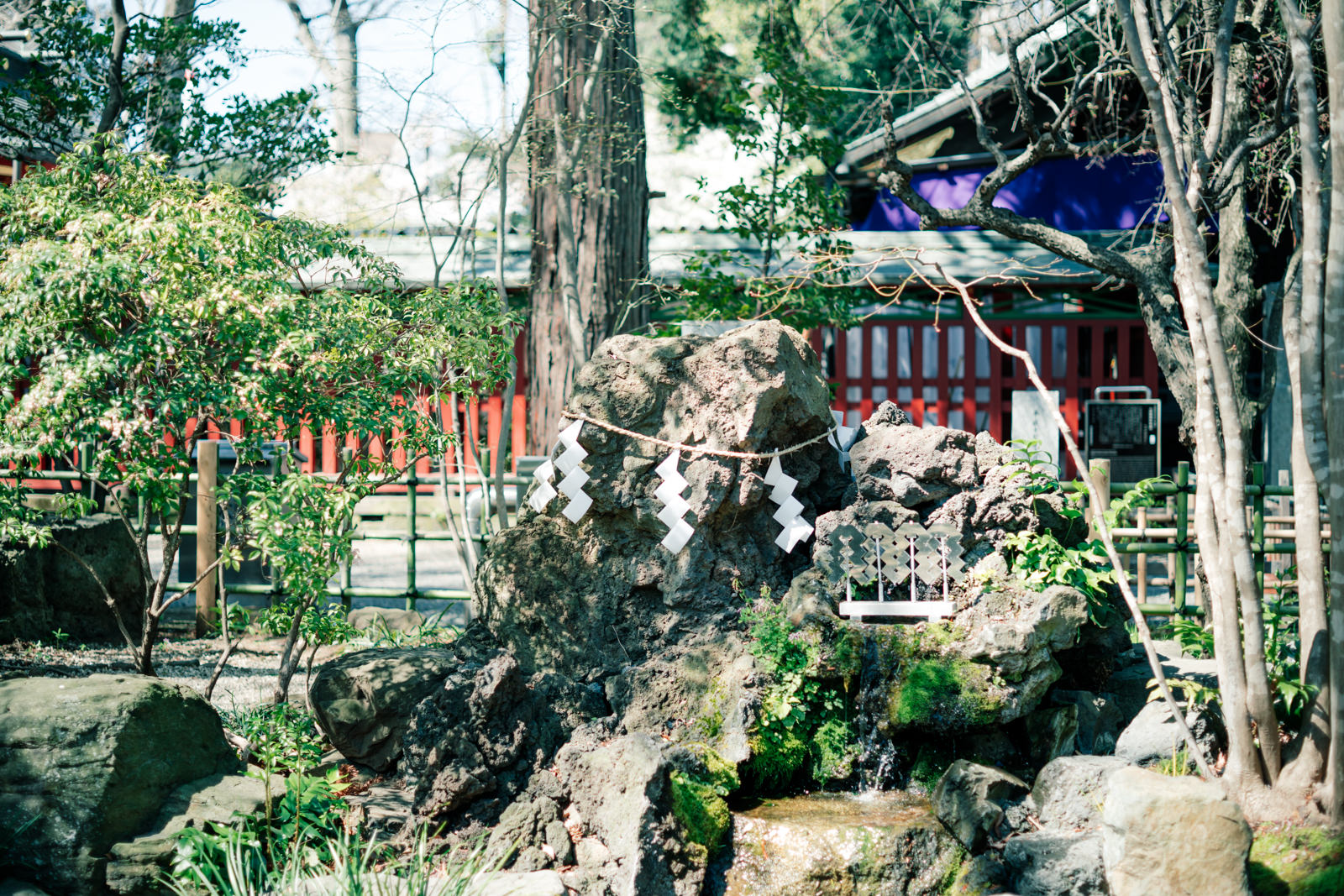 至る所に桜の木が見受けられます。水神社では深井戸を利用して地下水を竜頭口より流しているとのこと。ちょうど反対側では厄や穢れを人形に移して水に流すことにより取り除くための人形流しという儀式も体験できます。