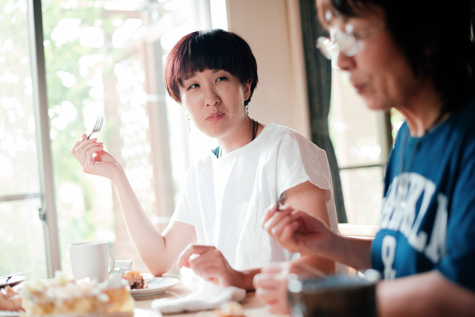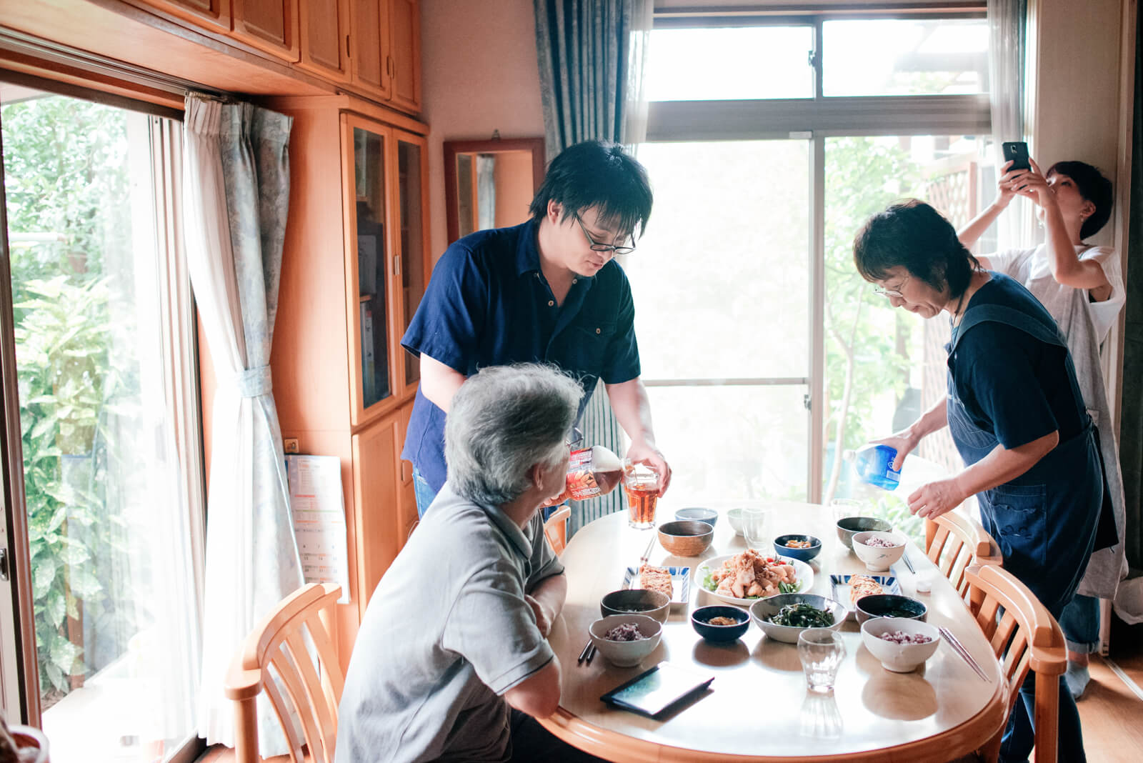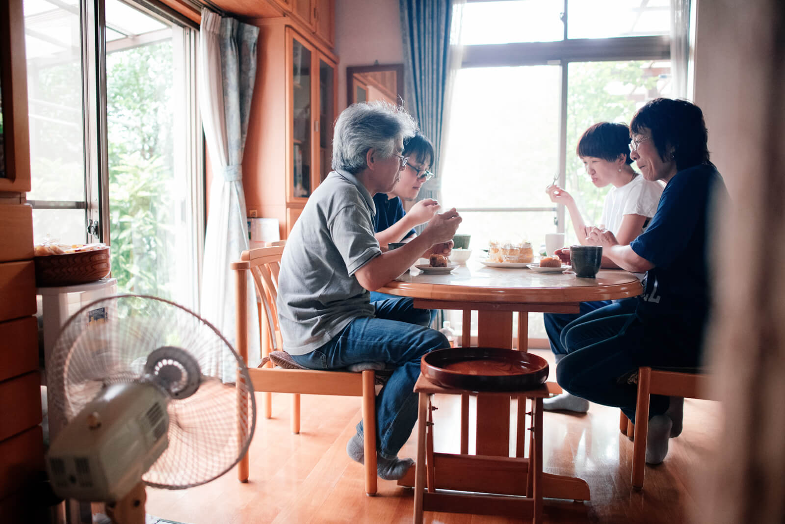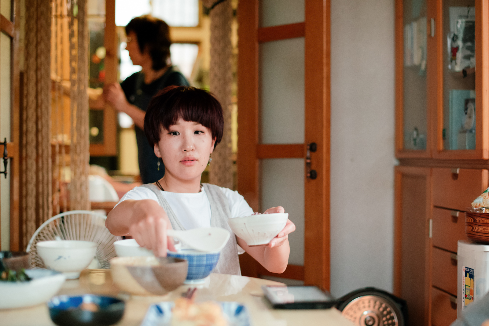 久美さん:夕貴ちゃんは本当に気さくで、 母は“初対面じゃないみたい!”と連発してたよね。常に私たちと雑談しながら、ふわりと撮影を進めていく夕貴ちゃん。 撮られているっていう緊張感はなかったです。 私がご飯の準備をし、母が手伝ってくれて、父は新聞を読みながら待っている。ご飯が出来れば弟が合流し、皆で食卓を囲む。 いつも通り食べ、いつも通り皆で片づけをし、コーヒーを淹れて、皆でホールのケーキを突っついて食べる(我が家の伝統。笑) 本当に、本当に、家族皆がいつも通りの時間を過ごせました。 いつも通りの、飾らない、普通の表情をたくさん捉えてくれました。