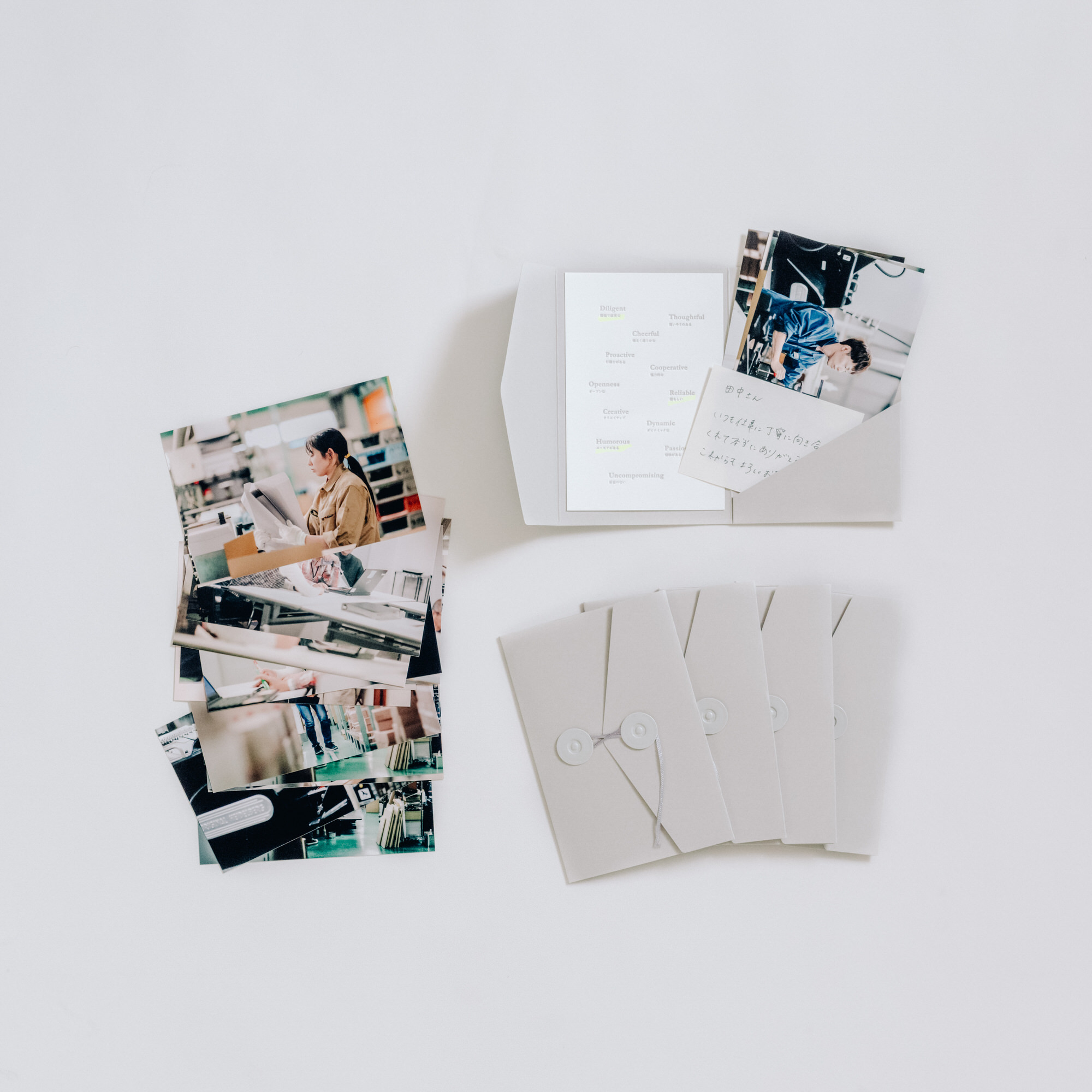 「良いデザインを共につくる」という哲学を大切にされている株式会社羽車は、従業員140名が「紙素材の良さを活かす・伝統的な印刷と加工を大切に・デザインも作り方もシンプルに」という考えのもとにチームワークを活かし商品開発を手がけています。代表の杉浦様をはじめ今回の撮影ご担当者様、また、スタッフの皆様の明るく思いやりのあるお人柄は、大きな会社を支えられている大切な要因なのだと感じました。撮影したお写真はメッセージと共に代表の杉浦様よりスタッフの皆様に手渡しで贈られました。